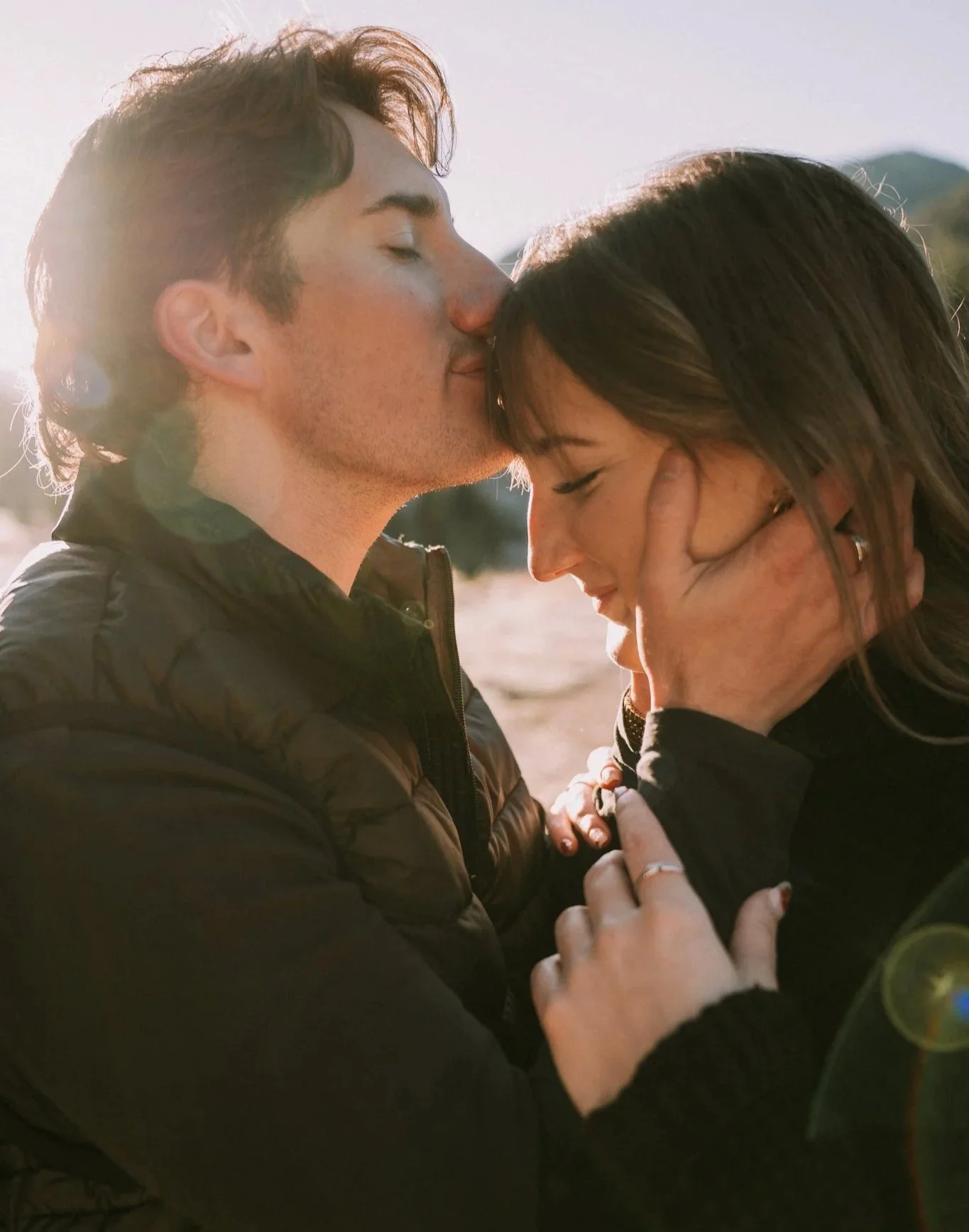 We started a little earlier than needed, and the entire session took about 90 minutes. Ideally, a full session will take 60 minutes, and then mini-sessions will be 20 minutes. I have a love for overshooting, so if there isn’t a time constraint, I won’t rush the fun. Since we were going to be in the mountains, I wasn’t sure exactly when the lighting would be ideal. Going off the sun tracker, golden hour started around 7:20 am in the valley. We arrived at the location around 7:35 am with blue hour lingering, so I got comfortable with prompting and dialed in my camera settings. Poor Tayler and Seth were bundled up in blankets for as long as possible.